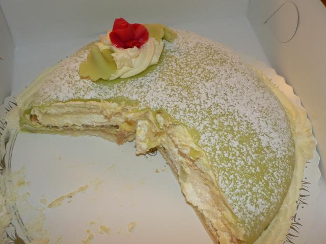 ケーキはやっぱり「プリンセス・トータ(prinsess tårta、王女様のケーキ)」。実は甘いものがあまり好きでない夫、そういう訳で最初は「サフランケーキにしよう!」と考えていたのですが、コンデトリーに行ったら「あー、これ、着色しているだけでサフランケーキではないのよ」と言われて、しょうがないから、ホールのプリンセス・トータを買いました。